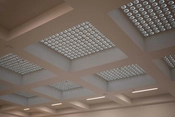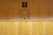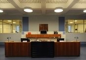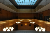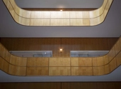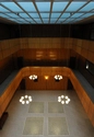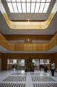 Bygningens aula med ovenlys strækker sig over tre etager med to balkoner. I gulvet er der otte felter med glassten, som skal oplyse lokalet nedenunder.