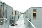 Som koncept har bebyggelsen karakter af en skurvognsby med åbne adgangsbroer og trapper.