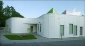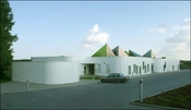 Bygningen består af fem runde volumener hvoraf de to vestlige (nederste) med personaleafsnittet danne ryg mod vejen og omverden.