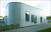 Facade mod vest. De to bygninger rummer personaleafsnittet og skærmer mod vej og omverden.