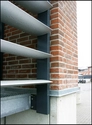 De udvendige brandtrapper er skulpturelt indrammet i form af tårne beklædt med lister af hårdttræ.