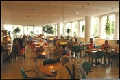 Patienthotellets restaurant i bygningens stueetage. Vinduesglassets blå farve opleves ikke inde fra bygningen.