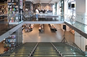 Blik fra bagvæggen i gadeplanet mod indgangsdøren. I forgrunden ses etagens runde ekspeditionsdisk.