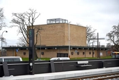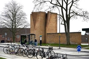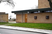 Kirken er opført i gule tegl med en lanterne øverst af aluminium.