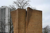 Klokketårnet ligger adskilt fra kirken og dets lave kompakte masse tager ikke magten fra det dominerende centrale kirkerum.