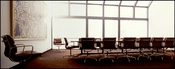 Det store møderum set ud mod den høje glasfacade og gården i syd.