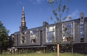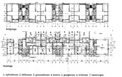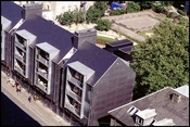 På boligernes østside er karnapperne afløst af store vinduespartier, og under boligerne skyder en børneinstitution sig ud i gårdrummet.