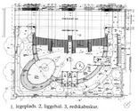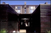 I daginstitutionen under etageboligerne stikker opholdsrummene ud i gårdrummets legepladser og afgrænses mod øst af sortmalede redskabsskure og hvilerum.