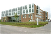 Facaden på den asymetriske bygning veksler mellem røde teglstenspartier og sprosseopdelte glaspartier.