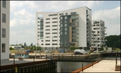 Det forreste hus Stævnen skal med sin markante tagkonstruktion og store hvide skiver i gavlene markerer starten på den 300 m. lange havnepromenade.