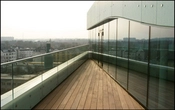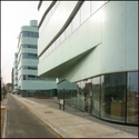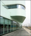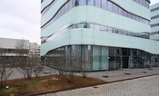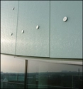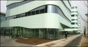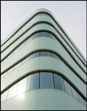 Facadernes udformning er muliggjort af en kassetteløsning, beklædt med med ornamenteret glas ophængt på stålsøjler. Vinduesbåndene sikrer, at der fra alle arbejdspladser er frit udsyn og godt dagslys.