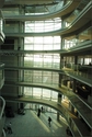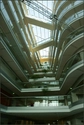 Helt centralt i det vinkelformede hus er det gigantiske atrium beliggende. Hovedindgangen til bygningen ses nederst i billedet.