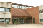 Facaderne fremstår forskudte med røde teglgavle og tagene har ensidigt fald mod gården. Indgangen markerer sig som et skråt kobbertag mellem to etager høje kontorfløje.