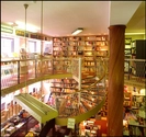 I dette tempel for bøger bæres loftsbjælkerne af to søjler beklædt med trælister, der som en barkstruktur snor sig op af stammen.