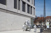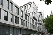 Facaden er opført i lyse natursten med facetter i facadeopbygningen der tilfører facaden et levende udtryk.