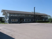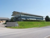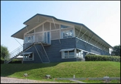Bygningens placering fremhæves af det stærkt udkragede tag.
