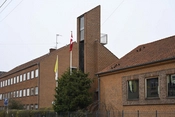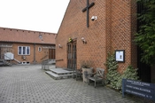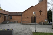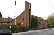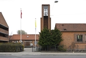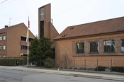 Katolsk kirke på Jens Jessensvej på Frederiksberg med overdækket klokestabel ved den sydlige gavl.