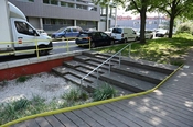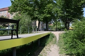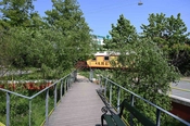 Hen over bassinerne løber en flot gangbro i træ med neongule sider, der giver parken en tydelig identitet. Indgangene til byrummet er markeret med kulørte lamper, der lyser op og byder velkommen. Undervejs giver en lille plads med en stor bænk mulighed for at se solen gå ned over Frederiksholm kirke, mens en anden plads giver plads til spontane møder og tango en lys sommeraften.
