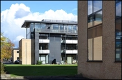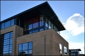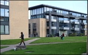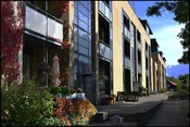 Boligbebyggelsen omslutter et større fællesareal og skifter med sin sorte metalbeklædning karakter mod dette område.