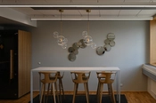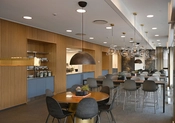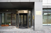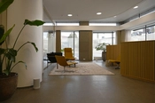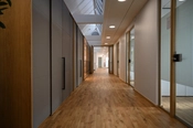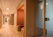 I foyeren hæver gulvet sig indbydende mod elevatordøre understøttet af det krumme loftsforløb.