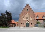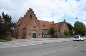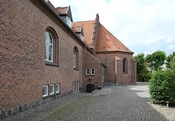 Mod Wibrandtsvej ligger præsteboligen og menighedshuset som sammen med kirken danner et trefløjet anlæg.