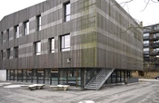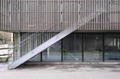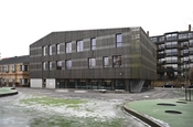 Åbenheden går igen i den perforererede træfacade, som gør tilbygningen let og luftig. Træet er bearbejdet og udformet, så de tværgående linjer fra hovedbygningen føres igennem og skaber en rød tråd igennem hele byggeriet. Som materiale udvikler træet en smuk patina, der matcher områdets øvrige bygninger, så skolen over tid vil opleves som en naturlig forlængelse af det lokale miljø.