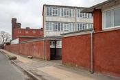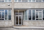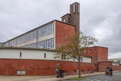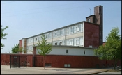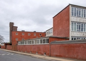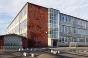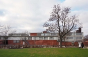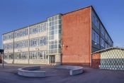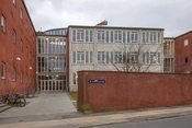 Skolen ved Sundet har store glaspartier og glatte betonfacader og er et typisk funkisbyggeri.