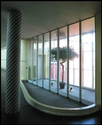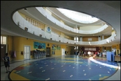 Skolens centrale aula med de buede former giver mulighed for at klasseværelserne kan få dagslys fra begge sider.