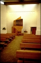 Orgelet og indgangen til kirkerummet samt den diagonale ganglinie mellem kirkebænkene.