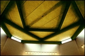 I loftet ses arkitektens bestræbelse på at skabe overgang fra en kvadratisk grundplan til en ottekantet loftkonstruktion, der igen indrammer to kvadratiske bjælkefigurer. Bemærk de store lysindtag i bygningshjørner (nederst) og de forholdsvis mindre vinduer mellem kirkens hjørnemarkeringer.