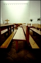 Kirkebænkene er komponeret af store planker til ryg, sæde og og knælestøtte.