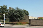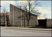 Mod Hvidovrevej fremstår den katolske kirke som en tilknappet teglstensfacade med to smalle vinduesspalter. Til højre for kirken fører en overdækket korridor ind til kirkerummet.