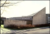 Mod nordvest kulminerer kirkens tagform i en spids, der bagved gemmer en hyperbolsk paraboloide.