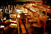 Kirkestolene er udformet med henblik på katolske kirkegængere, der under messen knæler på en gennemgående planke på den foranstående bænk med ansigtet mod alteret.