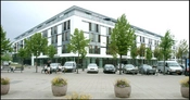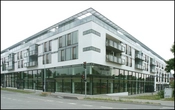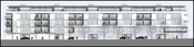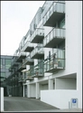 Den hesteskoformede hvide bygning har parkering primært i kælderen med også i stueplan
