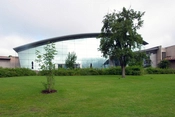 Det nye indgangsparti som betjener både den oprindelige (blå) og den nye svømmehal.