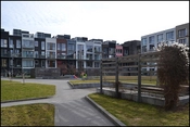 Hver karre lukker sig om et stort, fælles gårdanlæg under hvilket parkeringsanlæggene er placeret.
