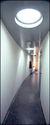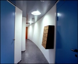 En krum gangforbindelse med cylindriske ovenlys binder boligens opholdsafdeling med soveafsnit og gæste/børneafdelig.