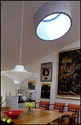 Spiseafdelingen er placeret umiddelbart foran køkkenet og på niveau med dette - en halv etage højere end opholdsafdeligen. Indersiden af det cylindriske ovenlys over spisebordet er malet blåt.