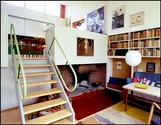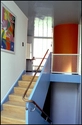 Interiør med trappen der fører fra hovedindgangen med råglansparti og ned til haven med arkitektens karakteristiske farvesætning med rød og blå.