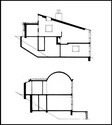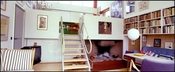 Fra spisepladsen fører en trappe en halv etage ned til opholdsstue og bibliotek. Det brede ovenlys ved havefacaden medvirker til at mindske lyskontrasterne mellem stue og haverum.