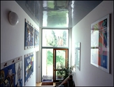 Det høje rum der fører ud i haven har opnået en særlig lethed ved at male loftet i en spejlende højglans.