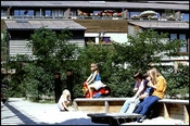 I hjertet af bebyggelsen ligger både legepladser og ældreboliger velbeskyttet. I baggrunden skimtes de store boligterrasser.