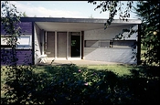 Huset er malet violet med sølvfarve på terrasseindhakket og sort på søjler og hovedrem.