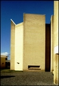 Klokketårnet er opført som en selvstændig kampanile, der fra tilkørselsvejen dækker for kirken. Indgangen ligger til højre mellem kirke og den lavere sognegård.