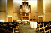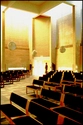 Indtryk af den diagonale hovedgang mellem våbenhus og alter. Bemærk de højtsiddende ovenlys og de lavtsiddende, horisontale vinduer.