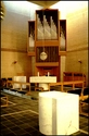 Nærbillede af hjørnet med alteret bag hvilket orgelet skyder sig op. I forgrunden døbefonten.