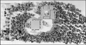 Fugleperspektiv af kirkeanlægget med kirkesalen til venstre, indgang og klokkestabel i midten og sognegården med konfirmandstuer til højre.