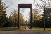 | Schønherr • Torben Schønherr • Landskabsarkitekt Torben Schønherr • Hans Jørgen Holm | 2000 - 2001Kapellet set langs sti, jernbåndene møder kapellets hjørner, ikke åbningerne