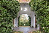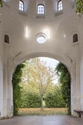 Kig gennem tp af kapellets fire åbninger, bygningen er på vej til at blive helt omsluttet af klatrevækster